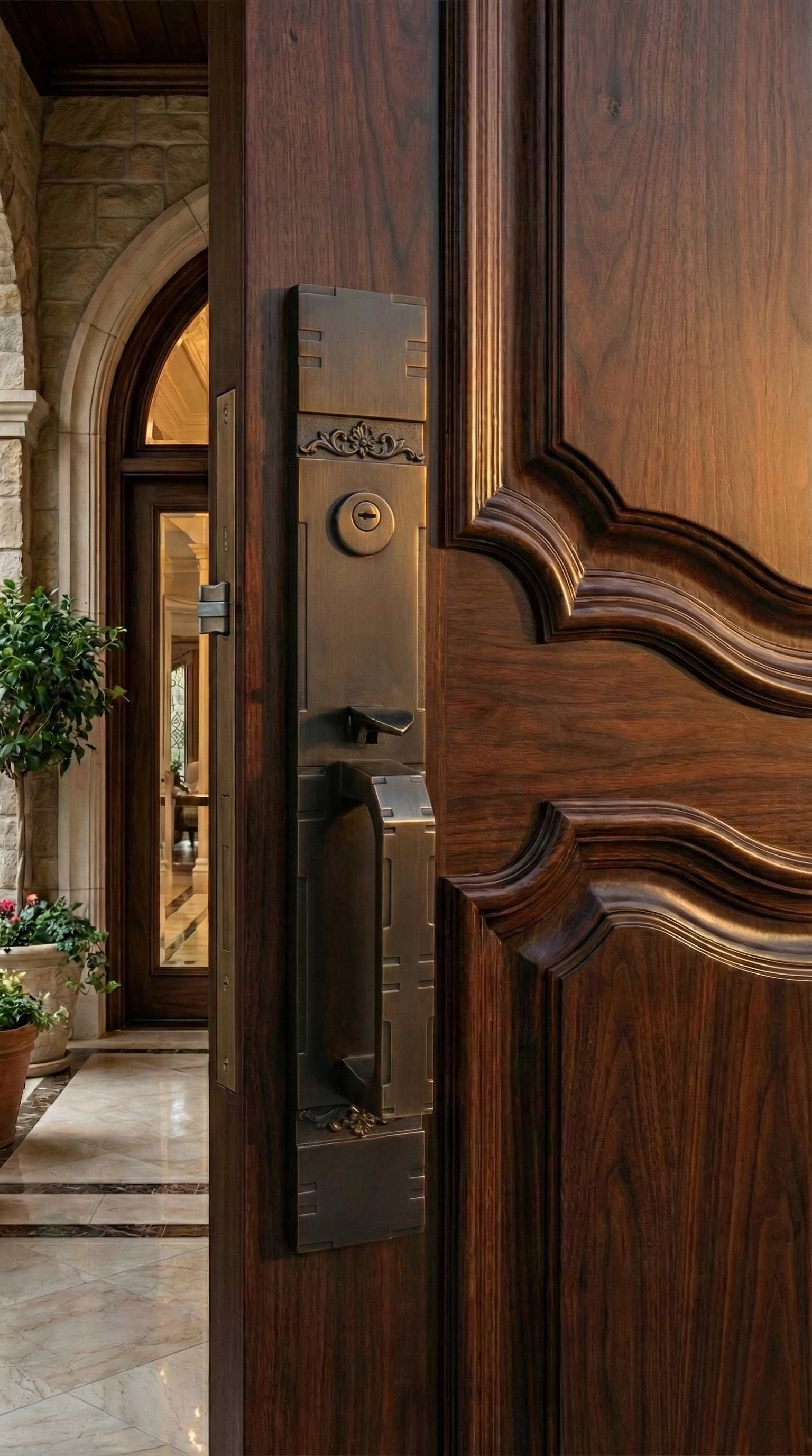 Make a bold, structural statement with the Craftsman Manor entry set. Defined by its clean lines and rectangular silhouette, this hardware brings a sense of grounded permanence to your entryway. The elongated escutcheon plate features subtle geometric stepped detailing and a singular, delicate scrollwork accent that bridges the gap between traditional elegance and modern minimalism.